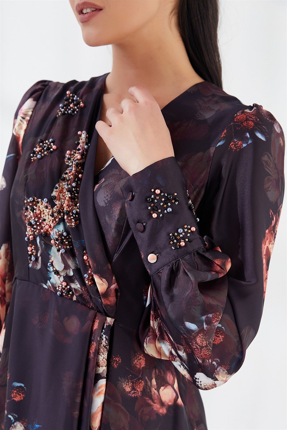 Kruvaze Yaka Çiçekli Uzun Elbise Siyah (SS22ELB0134_001)
